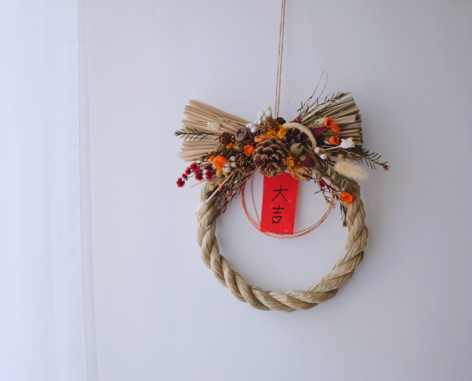 注連繩 しめなわ 源自日本,由乾草圍繞而成的的草圈,加上花草植物和新年的裝飾,寓意富貴吉祥,趨吉避凶。🏮