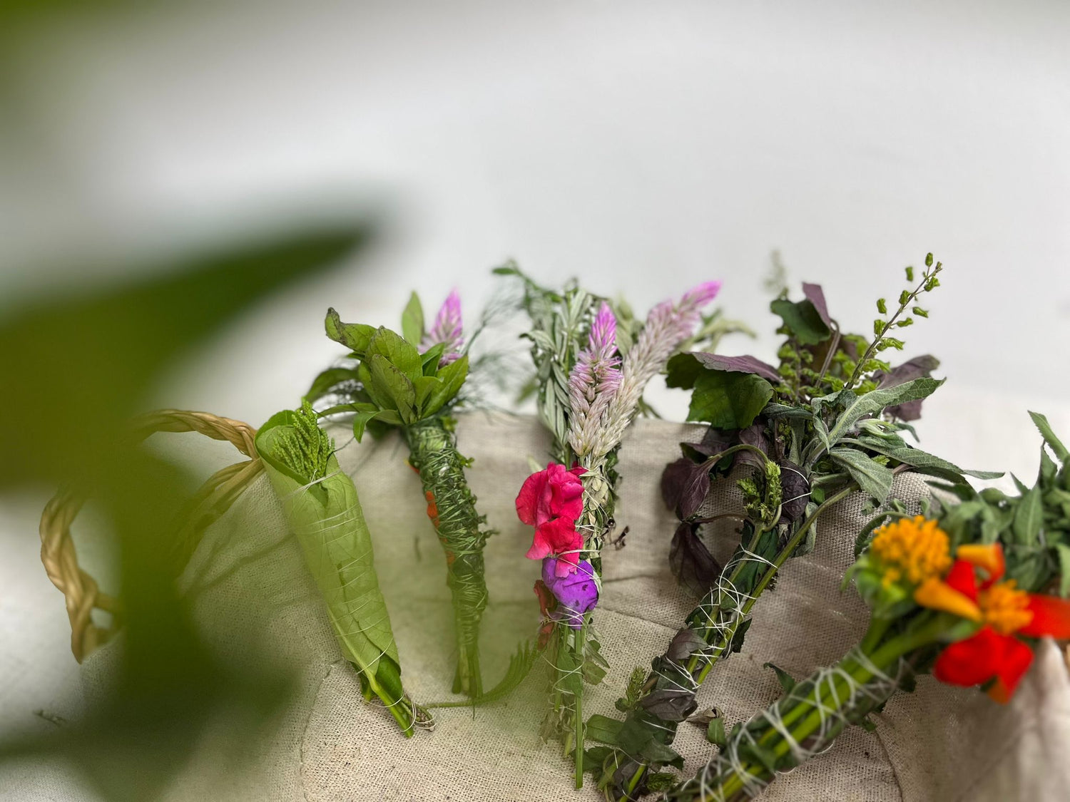 從本地農場收集的香草和野花,經過綑綁和風乾後,成為了散發香味的薰香棒,為環境添上生氣。